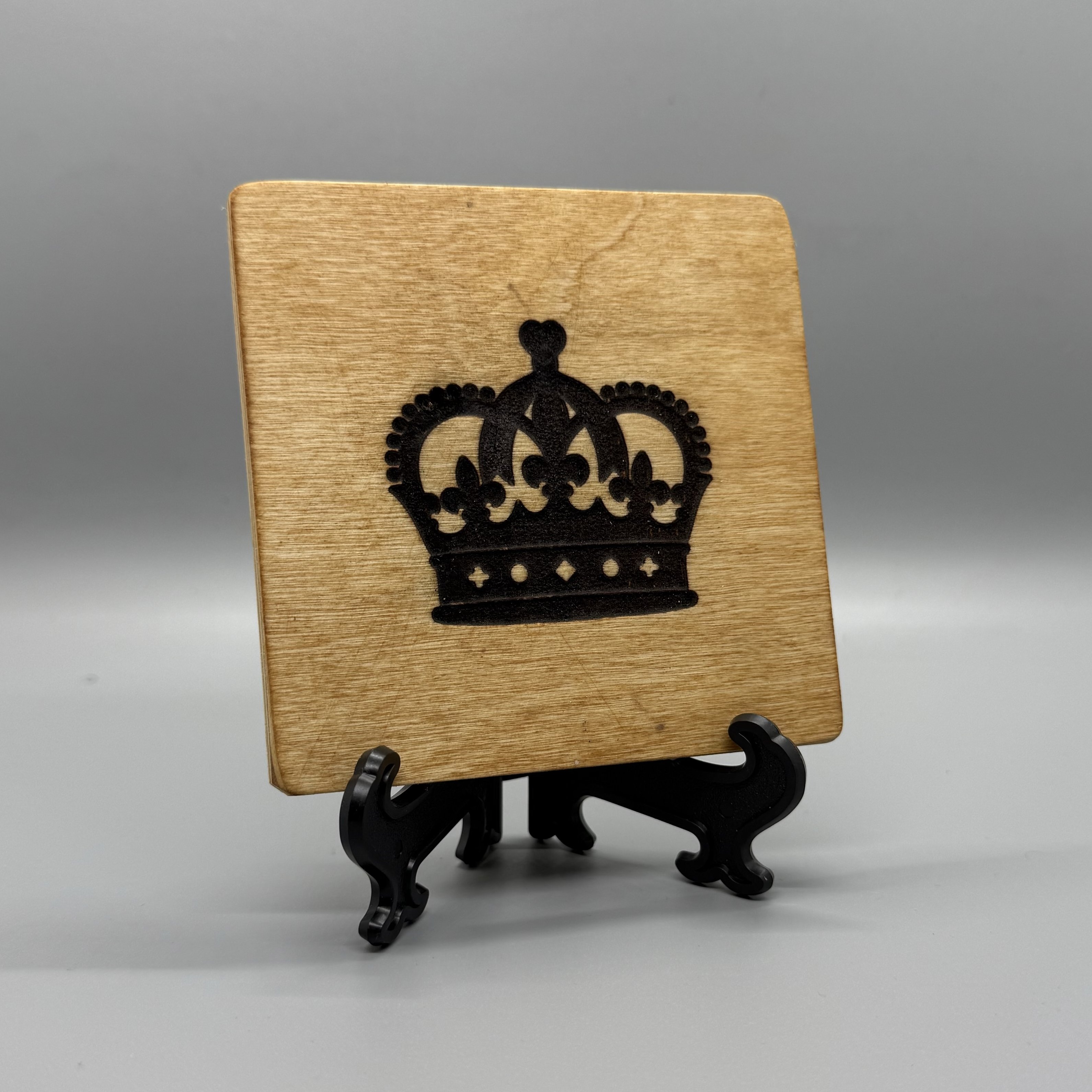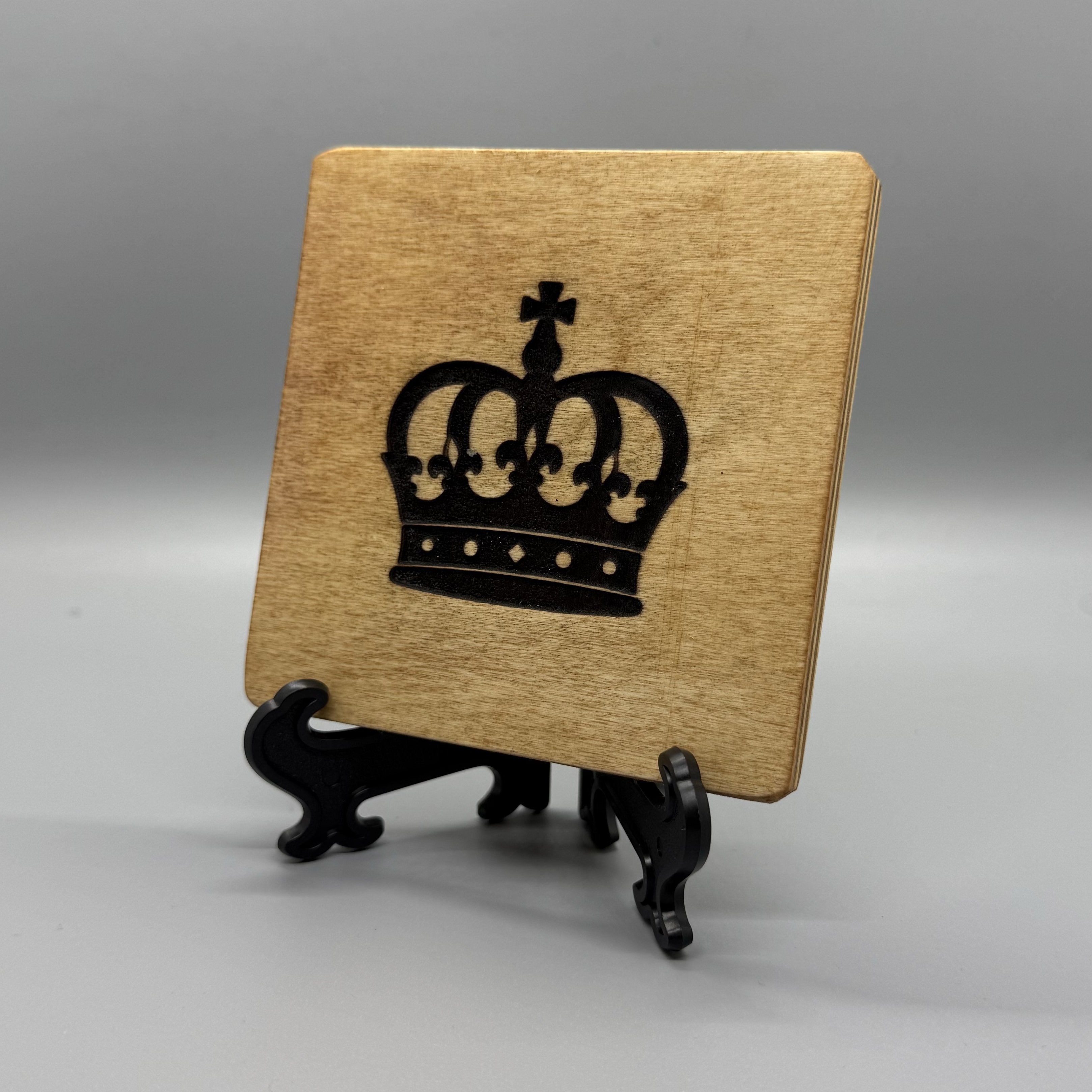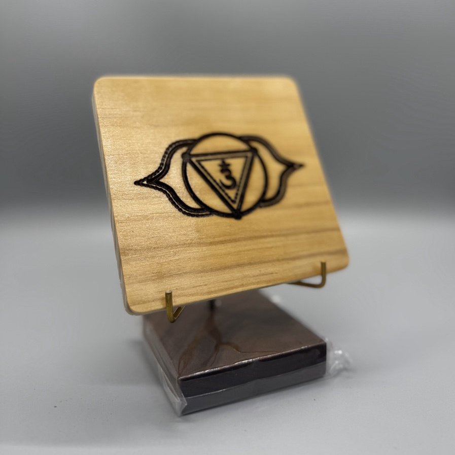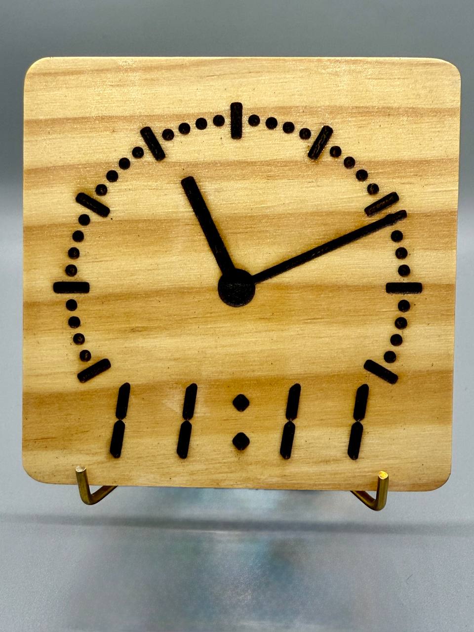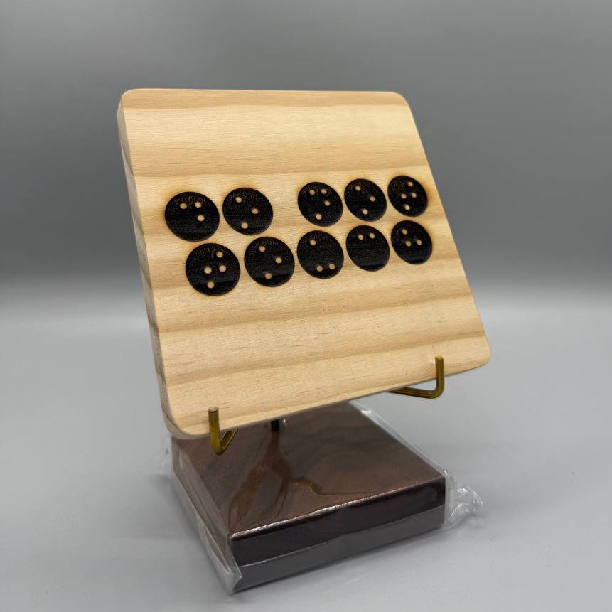 'Do not touch' in braille engraved on a wooden square. Name on top along side 'Property of'.