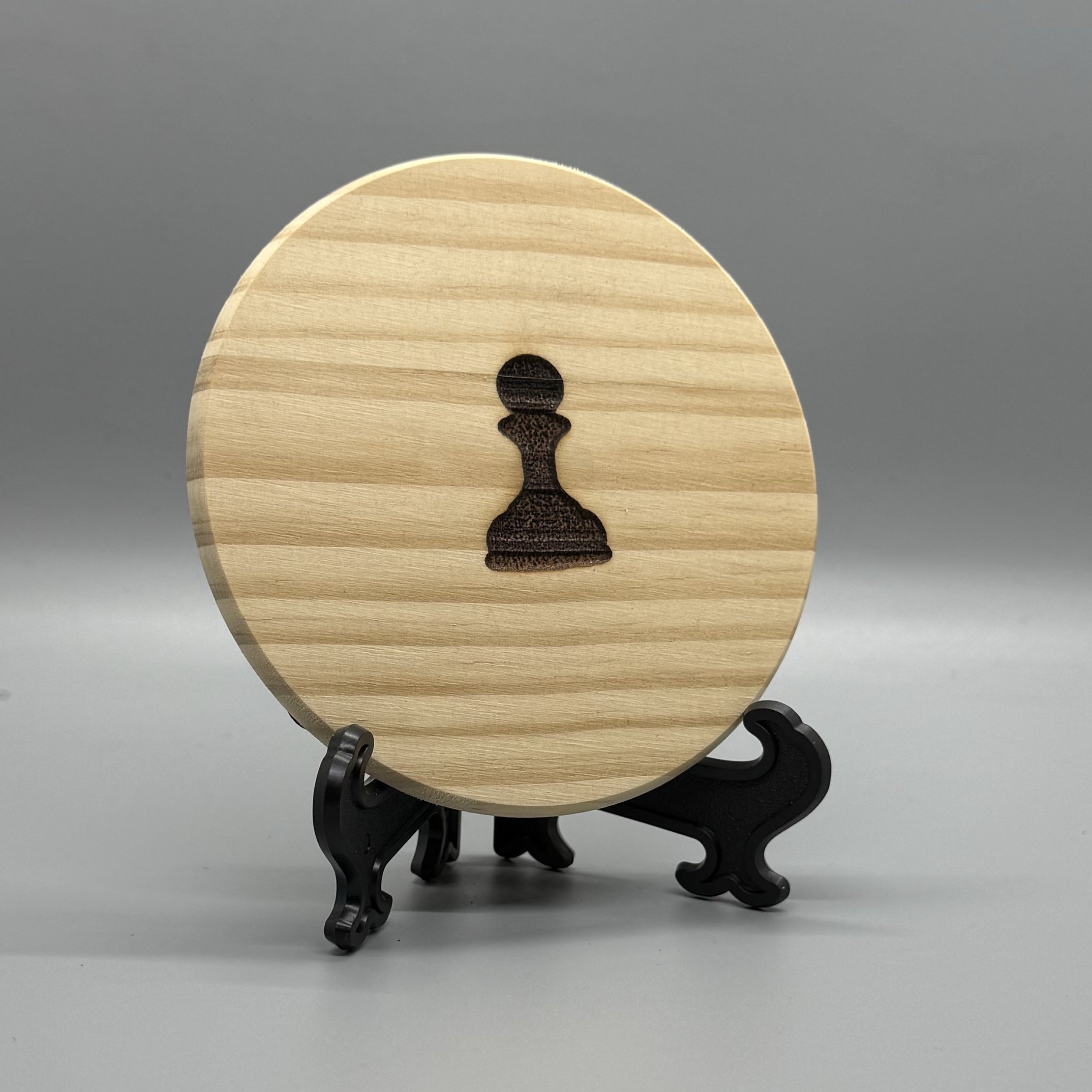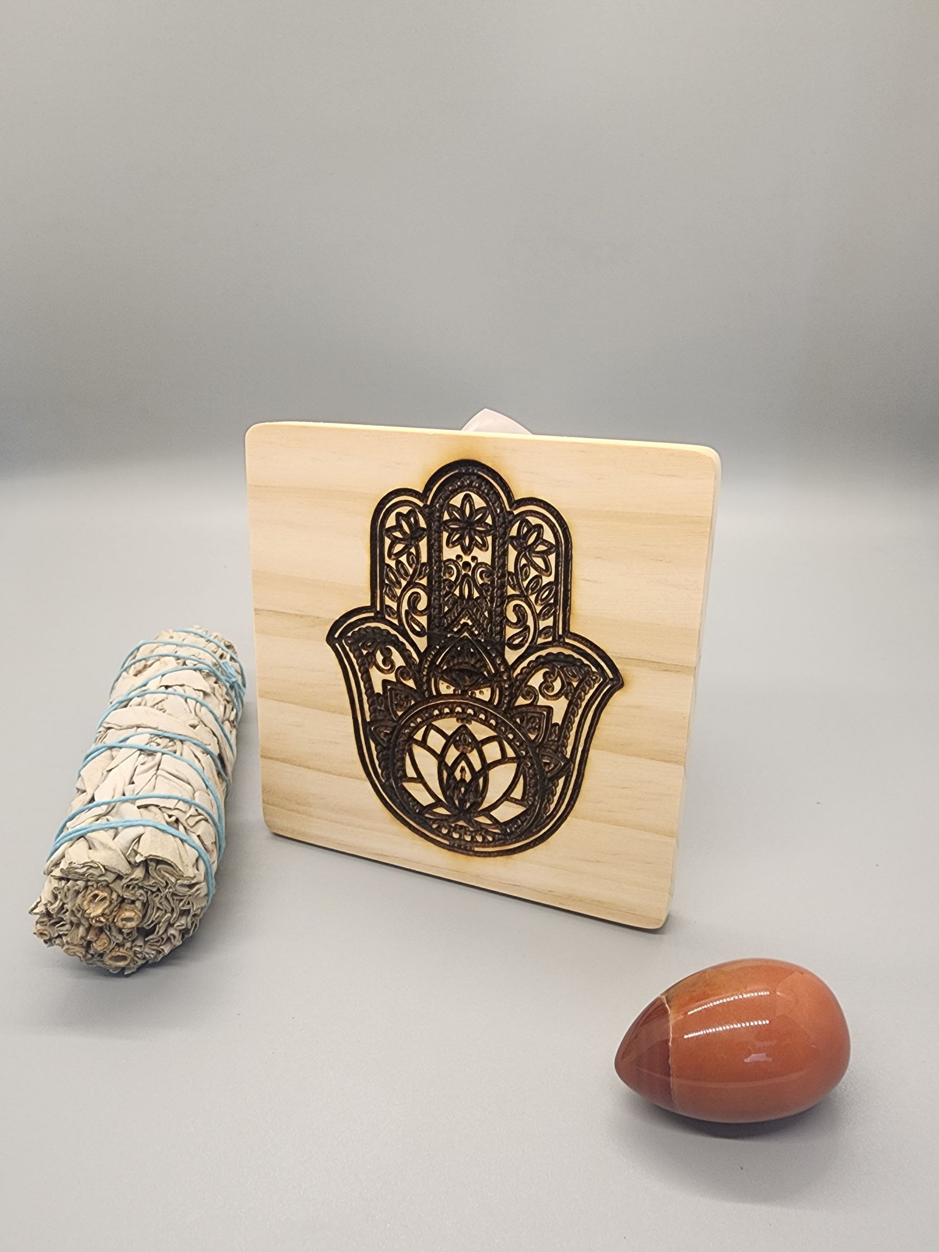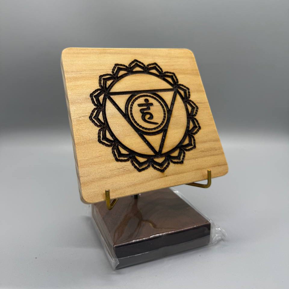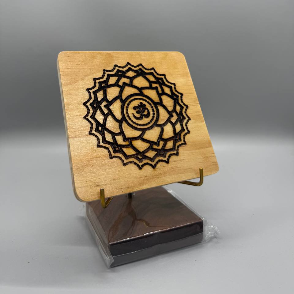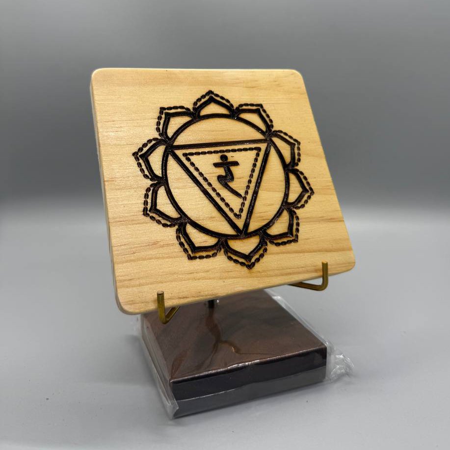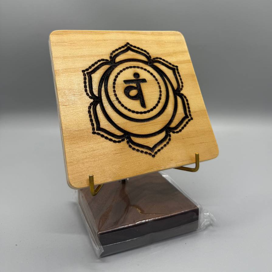 'Do not touch' in braille engraved on a wooden square. Name on top along side 'Property of'.