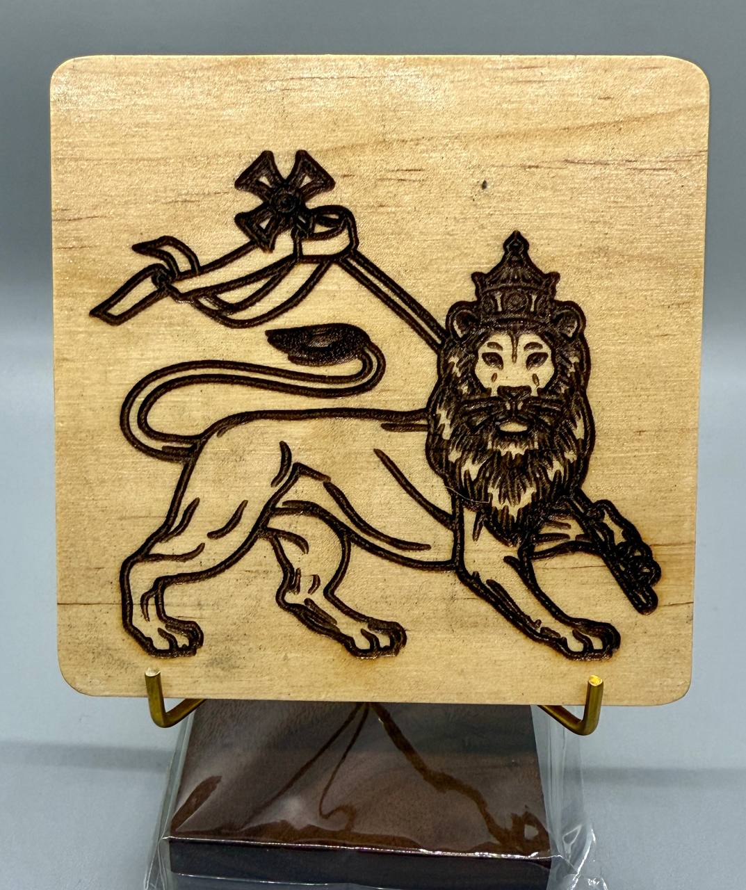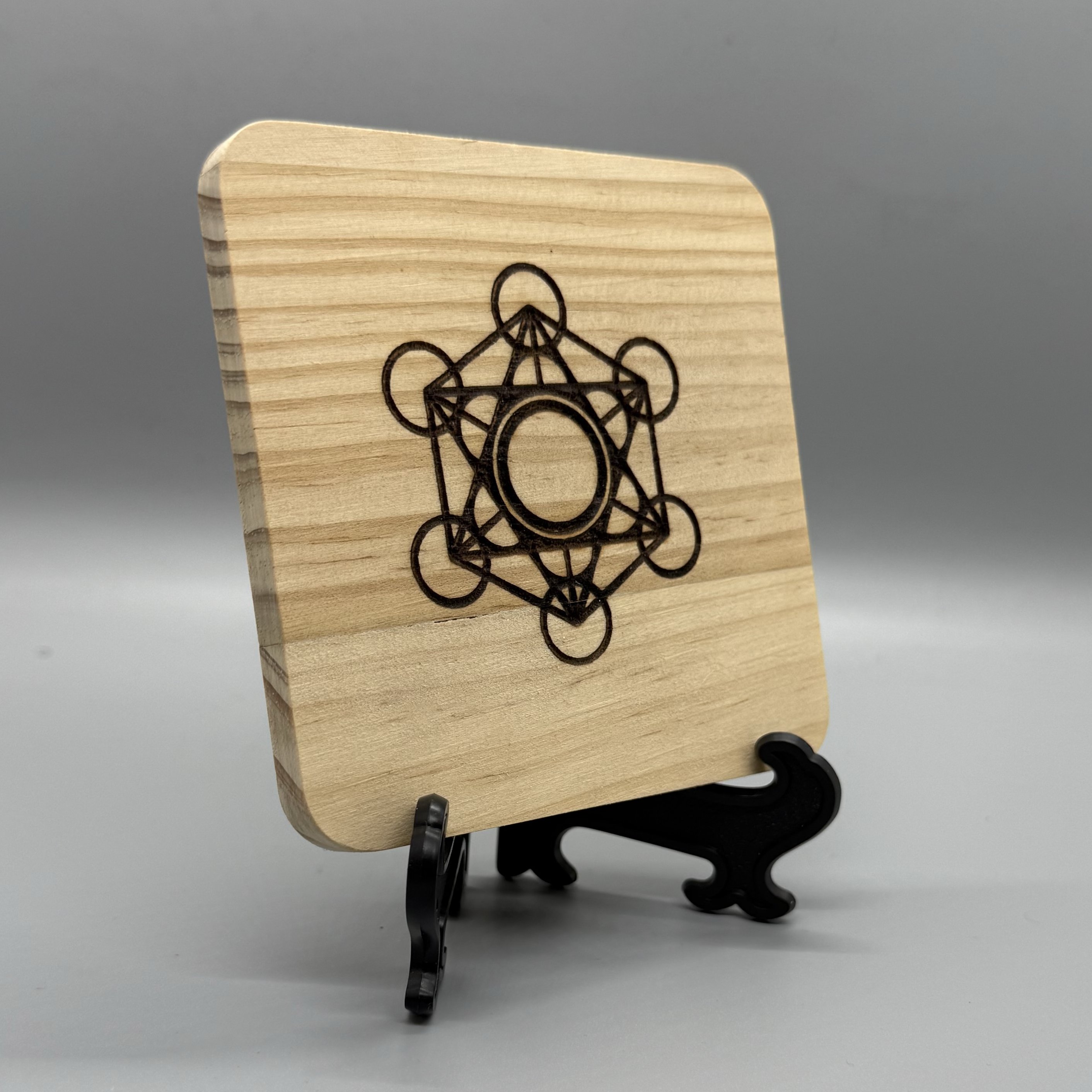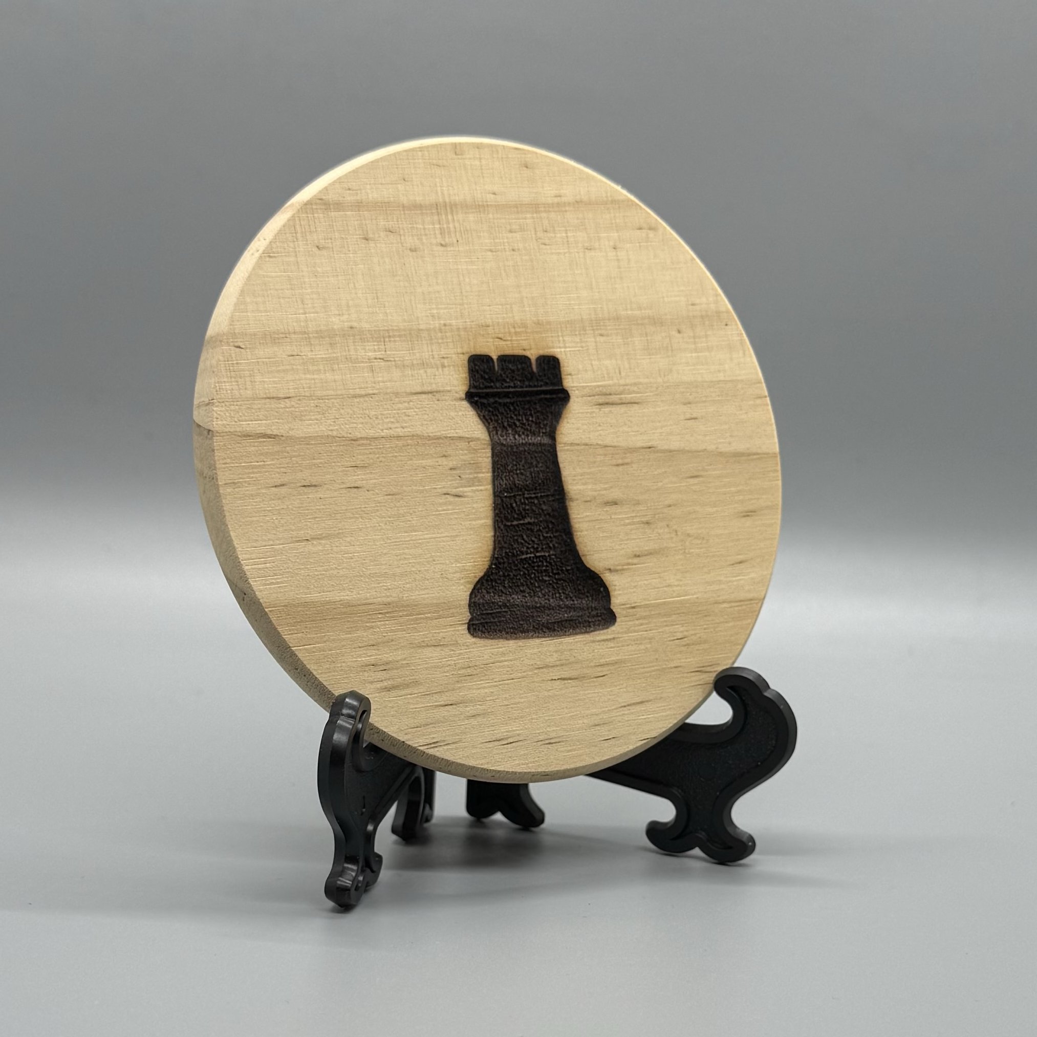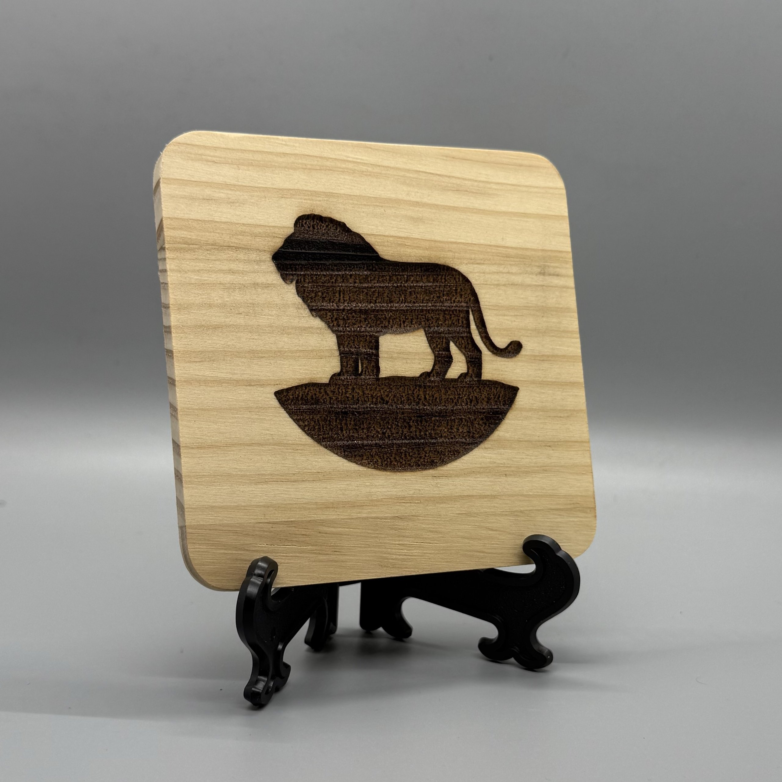 'Do not touch' in braille engraved on a wooden square. Name on top along side 'Property of'.
